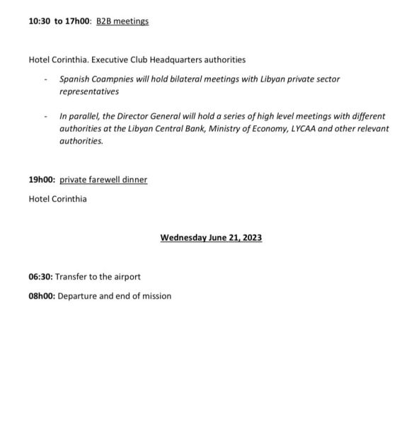 ستعقد الشركات الإسبانية لقاءات ثنائية مع ممثلي القطاع الخاص الليبي بالتوازي مع ذلك ، سيعقد المدير العام سلسلة من الاجتماعات رفيعة المستوى مع مختلف